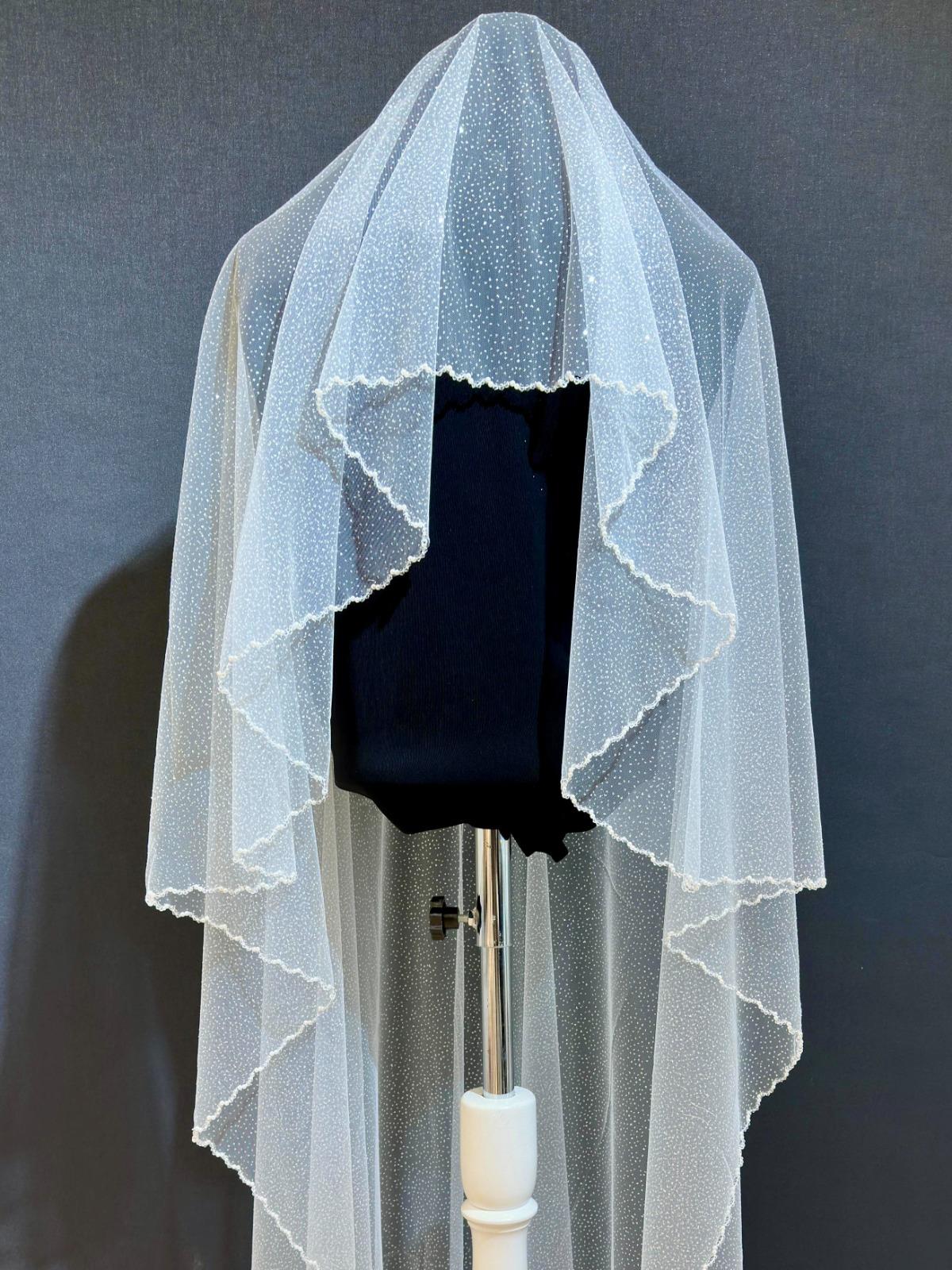 Göz Alıcı Simli Doku: Kumaşın kendi dokusunda bulunan ince simler, duvağa homojen ve asil bir parıltı kazandırır.